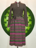 黒地に赤茶緑などの花ボーダー柄スタンドカラーワンピース