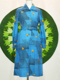 青地に黄色の花と黒のグラデーション幾何学模様ワンピース
