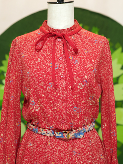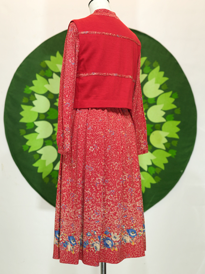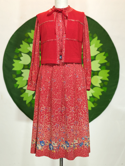 赤地にベージュや水色の花柄ベスト付きワンピース