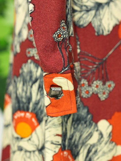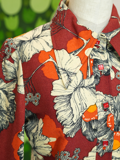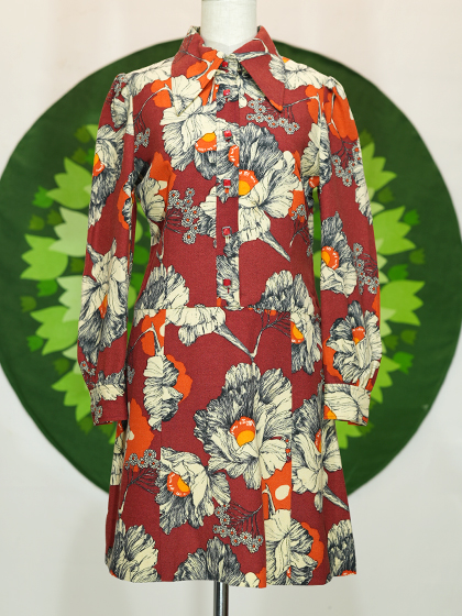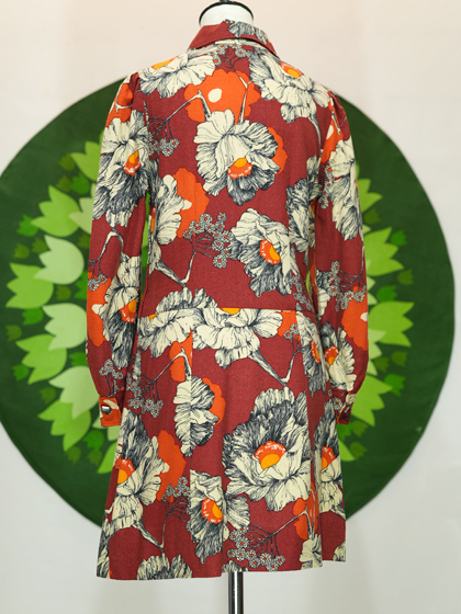 えんじ地に橙や生成りの大きな花柄ワンピース