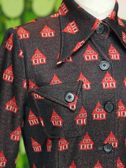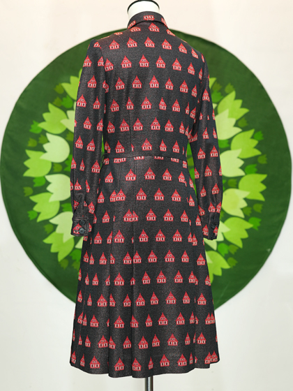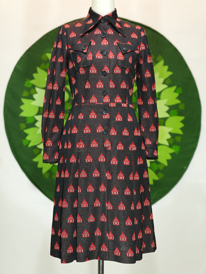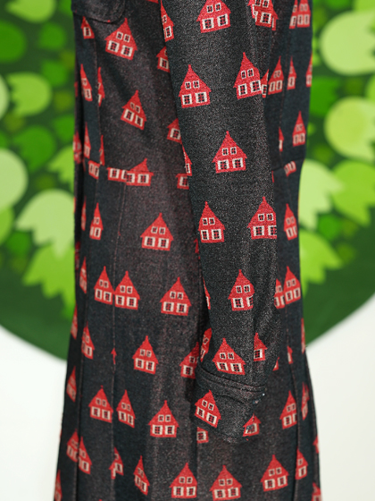 ラメ入り黒地に赤の家の柄ワンピースです。
