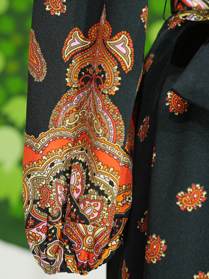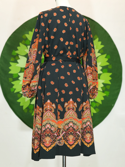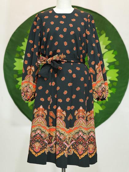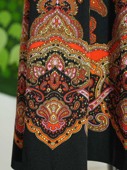 黒地に橙などのサイケペイズリー柄ワンピースです。