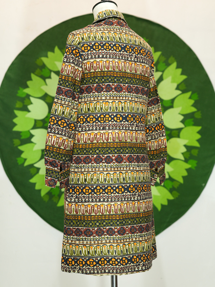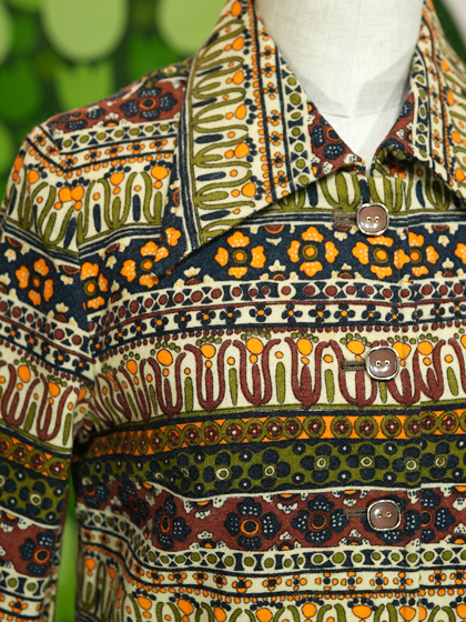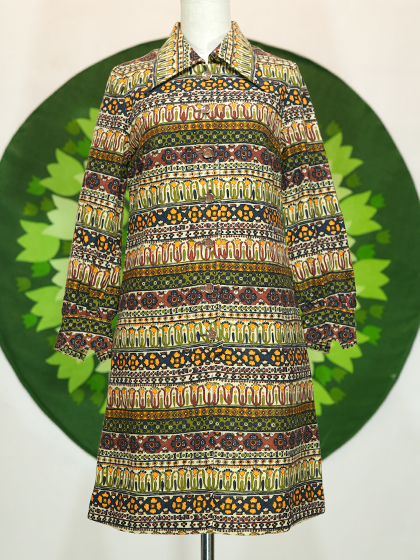 アイボリー地に黄茶緑などの花ボーダー柄ワンピース