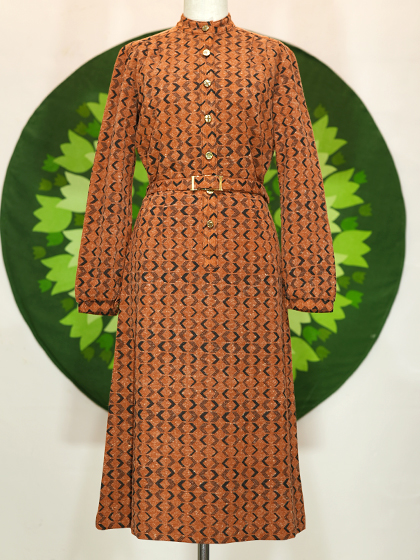 茶色地に黒の<>柄スタンドカラーワンピース