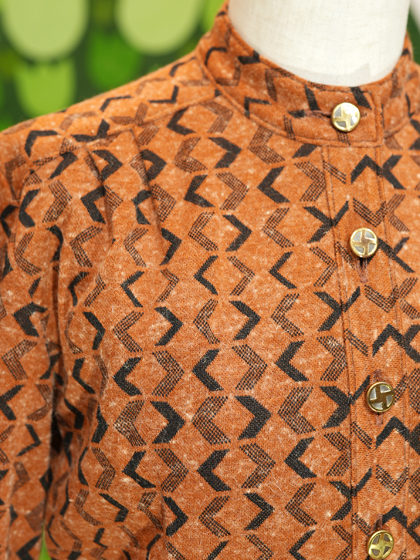 茶色地に黒の<>柄スタンドカラーワンピースです。