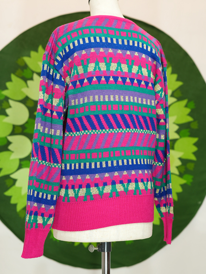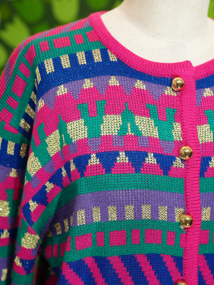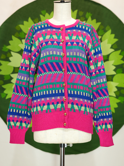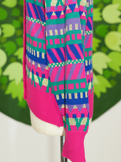 ピンク地に紺緑紫ラメの柄カーディガンです。