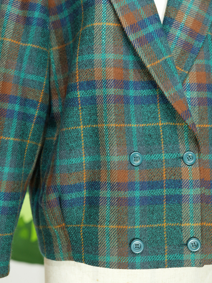 緑青茶などの格子柄ダブルボタンジャケット