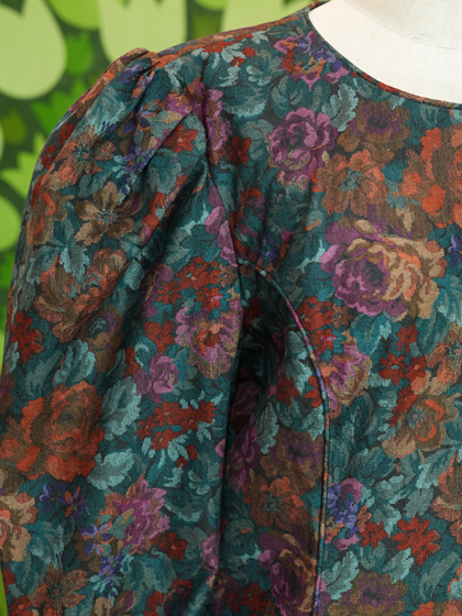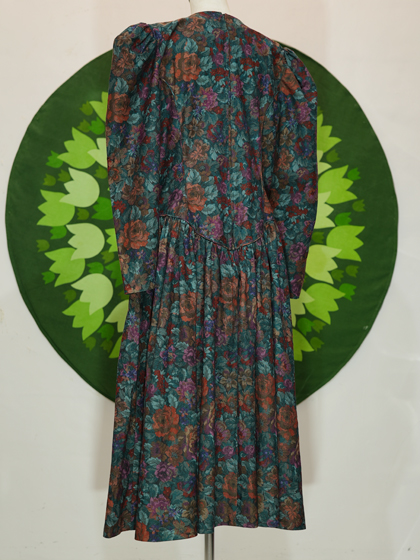 青緑地に赤橙ピンクなどの花柄ワンピース