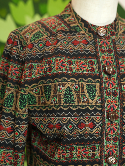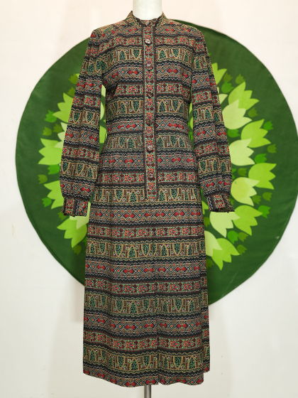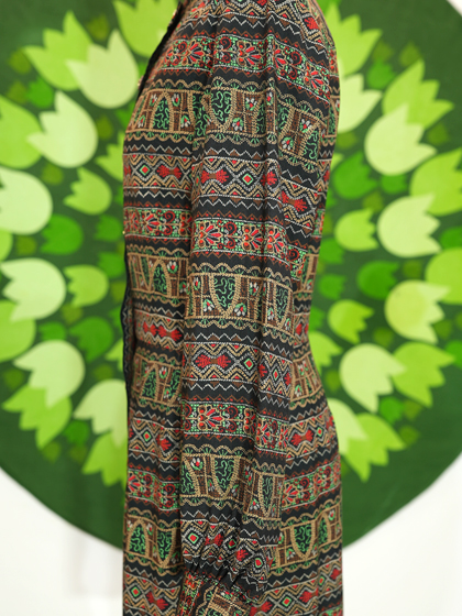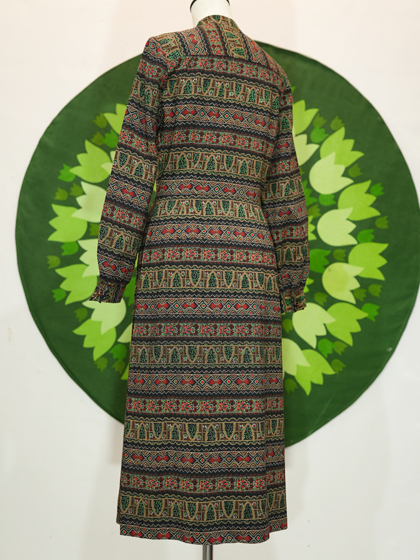 黒地に赤茶緑などの花ボーダー柄スタンドカラーワンピース