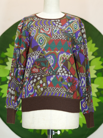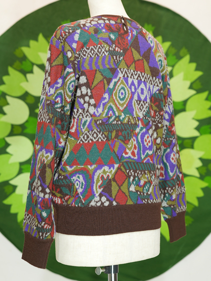 茶色地に赤青緑などの花やダイヤ柄ニット