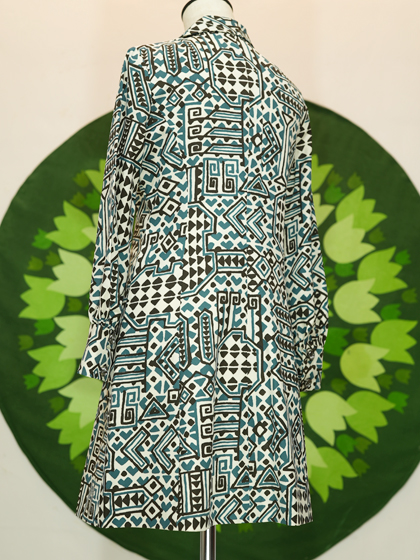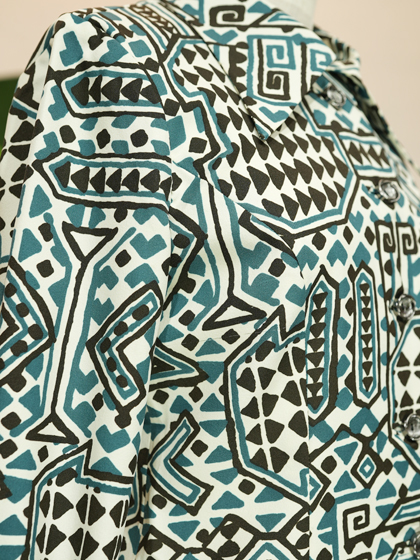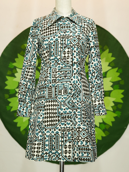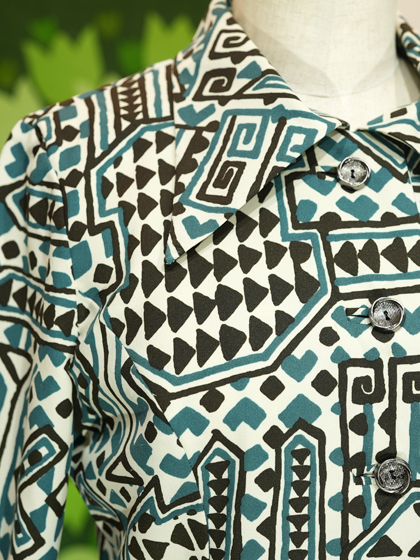 白地に黒と青緑の手書き風幾何学模様ワンピース