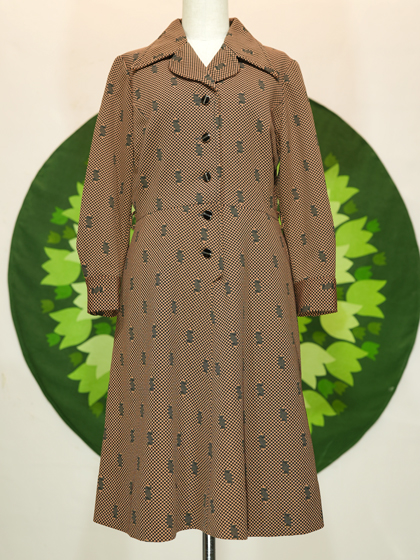 茶と黒の帯とブロック柄開襟ワンピース