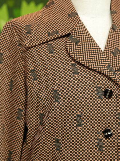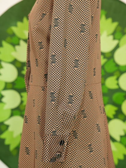 茶と黒の帯とブロック柄開襟ワンピースです。