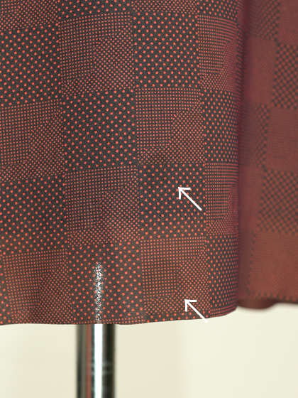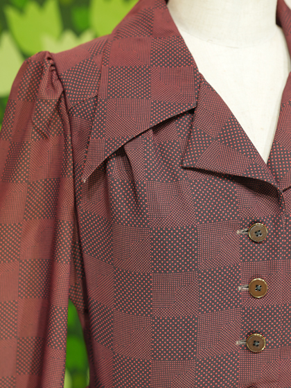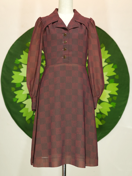 えんじと焦茶のドットと格子柄ワンピース