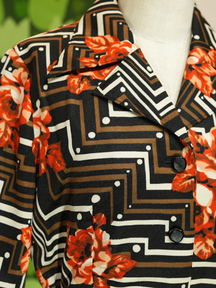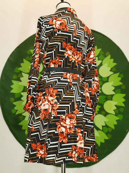 黒地に朱色の花と白と茶の直線柄ワンピース