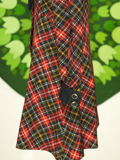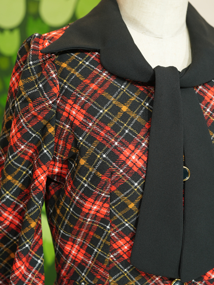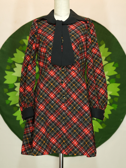 黒地に赤白ななめ格子柄リボンタイワンピース