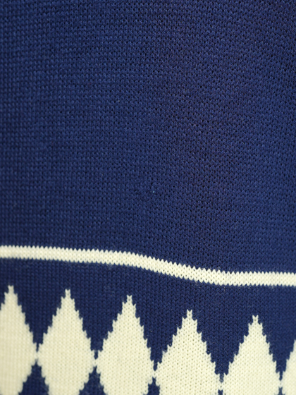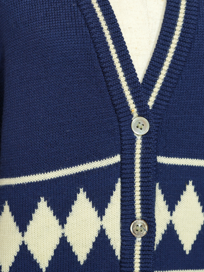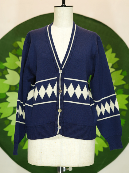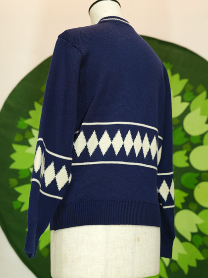 紺地に白ラインとダイヤ柄Vネックカーディガンです。